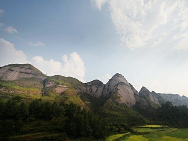 金钟山,位于施秉县南面的清水江北岸,即今马号乡的巴团、江元哨、龙间。距县城47公里,镇(远)台(江)公路和施(秉)马(号)公路通过该地,交通便利。金钟山,峭壁撑天,奇峰拔地,主峰海拔977米。犹如一尊巨石矗立天际,全由石沙结成,上削下广,形圆肖钟,如刀凿,如斧削,无泥土,无草木,可谓"通体无毛"。主峰左右各有三峰,挨次低小排列如儿孙,故民间相传,金钟山与香炉山,本是一对恩爱夫妻,从东方迁徙而至,香炉山是丈夫,行动利索,赶路在先;金钟山是妻子,拖儿携女,行走在后。因闻鸡鸣而止,后化为石,从此两地分立,遥遥相望,时逢云雾缭绕,便是夫妻带儿女团聚。主峰顶上有平台一亩余,"其上有土可以艺蔬,有泉可以煮茗,版权所有山东聊城聊之旅国际旅行社有限公司,转载必究!花竹草木无一不备"。前人依山就势,凿石掘蹬为径,旋绕攀登面壁而上。山巅平地建有庙宇供奉神灵,原有正殿一栋3间,后殿一栋2间。房顶有钟楼,悬挂大钟一口,正殿左殿有一栋僧房,屋外气有大小石井两口。半山之腰,有泉水一股冒出,粗如刀把,四季无消涨。