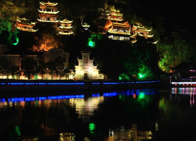 青龙洞古建筑群坐落在中国历史文化名城——镇远城东的中和山上。这里山势挺拔,峭壁悬崖。巨岩、洞穴和为一体。道、儒、佛三种宗教的寺庙群生就山腰。它背靠青山,面临绿水,贴壁临空,五步一楼,十步一阁,翘翼飞檐、雕梁画栋。这些古建筑依山因地,分别采用了“吊”、“借”、“附”、“嵌”、“筑”等多种工艺,硬是在一段悬崖上筑出中元洞、紫阳洞、青龙洞、万寿宫等一片阁楼洞天。它气势雄伟、构思大胆、布局精巧。于1988年被列为全国重点文物保护单位。青龙洞建于明代中叶,至今已有近500年的历史,曾几度毁于兵、火,几度修复,古建筑群经历代修建始成现代规模,位于城东中河山,占地21000平方米,有青龙洞、紫禅书院、中禅院、万寿宫、祝圣桥和香炉岩6部分共36座单体建筑组成,集儒、道、佛、会馆、桥梁及绎道建筑文化于一身。版权所有山东聊城聊之旅国际旅行社有限公司,转载必究!整群建筑靠山临江,依崖傍洞贴壁凌空、勾心斗角,错落有致。那飞岩翘角、贴壁凌空、红墙青瓦的殿阁楼台,气势宏伟。造型独特的建筑物与悬崖、古木、藤萝、岩畔、溶洞天然合成,融为一体,真是巧夺天工。既有临江远眺的吊脚楼,也有恬静幽邃的寺院禅台,有朗朗书声的学子院,更有锣鼓喧天的戏台,集天下山水楼阁荟萃为一方。整个建筑群重重叠叠参差不齐,纵横有致,沿庭院小径漫步,登斯楼而极目,如临海市蜃楼,蓬莱仙岛。为江南汉地建筑与西南少数民族山地建筑文化相结合的绝妙典范。有“西南悬空寺”之称,是贵州省规模最大的古建筑群。1988年经国务院批准被列为国家级重点文物保护单位。史载,距今600多年的明洪武年间,此地便已形成与现存建筑群相当的规模,“明郡守黄希英建,工部郎中赵之绪购藏经,构层楼以贮之”。清嘉靖年间这里不仅增加了大量寺庙,而且有了宫室和书院建筑,后多有改扩建。雍乾时又有了万寿宫等商业性会馆建筑及戏楼。光绪四年,又增建了祝圣桥上的状元楼(亦称魁星楼)。1956—1963年间,省州政府拨出专款,组织专人对青龙洞建筑群两度较大维修,后又对中元洞一组修复。1983年起,省政府再次拨巨款对青龙洞、紫阳洞、万寿宫、香炉岩等各组古建筑全面抢救和修复,青龙洞古建筑群得以恢复原貌。此建筑名胜有如群星 灿烂,通常以青龙洞概言之,成了历代游人流连忘返之地,文人骚客咏叹之物。清人陈夔龙诗云: