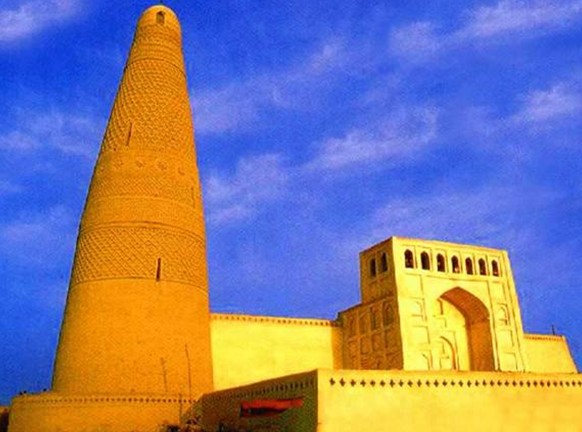 与寺紧挨着的苏公塔,整个砖砌,由台上量起高44米,顶上为圆形,直径2.8米,下径扩大甚多,为11米。塔下为高台,版权所有山东聊城聊之旅国际旅行社有限公司,转载必究!高台旁边是公路,公路又低于高台约10余米,所以在寺外仰视,高塔凌云。同时塔身上又满布花纹,如缨络、锦绣等。只此一塔,便使古城增添了无限的生气。塔形浑圆,全部砖砌,中有螺旋形赔道,盘旋直达塔顶。这样壮丽奇伟的大砖塔,其砌造技艺是我国清真寺建筑中一项伟大贡献,也是勤劳的维吾尔族人民表现在建筑技艺上的一大成功。