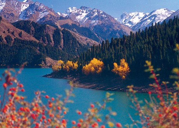 灯杆山距天池西岸4公里,于层峦峡谷中突兀崛起。主峰海拔2718米,顶峰耸立着3块巨大的石笋,其状如戟,直刺长空,又称“顶天三石”。神话传说是王母娘娘降妖伏魔的绣花鞋化生。这里是天池观落日和欣赏古冰川地貌的绝好去处。