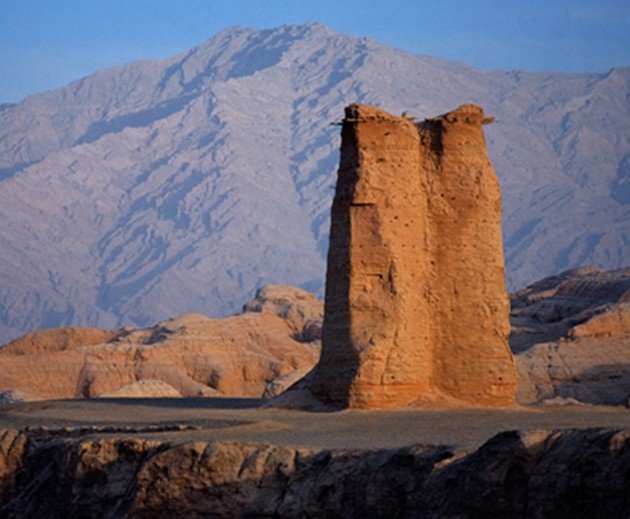 克孜尔尕哈烽燧位于库车县城西北盐水沟东侧,在维吾尔语中为“红嘴老鸹”或“红色哨卡”之意,这座巍峨的古军事建筑,历经2000多年的风风雨雨,至今依然雄姿犹存,是丝绸之路上最古老、目前保存最完好的烽燧遗址,2001年由国务院公布为全国重点文物保护单位。