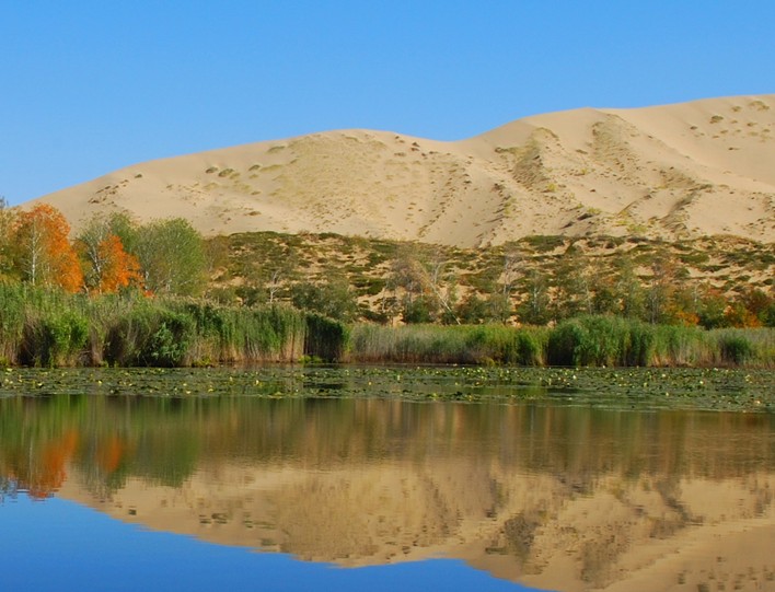 白沙湖,湖面只有0.5平方公里。是个独立于浩瀚沙漠中的原生态沙漠湖,没有进水与出水口,沙漠里一般蒸发量都比较大,但这里的水位多年来却没有变化,更不因季节变迁而增多或减少。景致构成十分独特,湖中四周生长着高达1—4米的密密丛生的芦苇、菖蒲等水生植物,湖中还有野荷花孤寂地生存着;湖周50米内,是高大茂密的杨树、白桦混生的林带。
