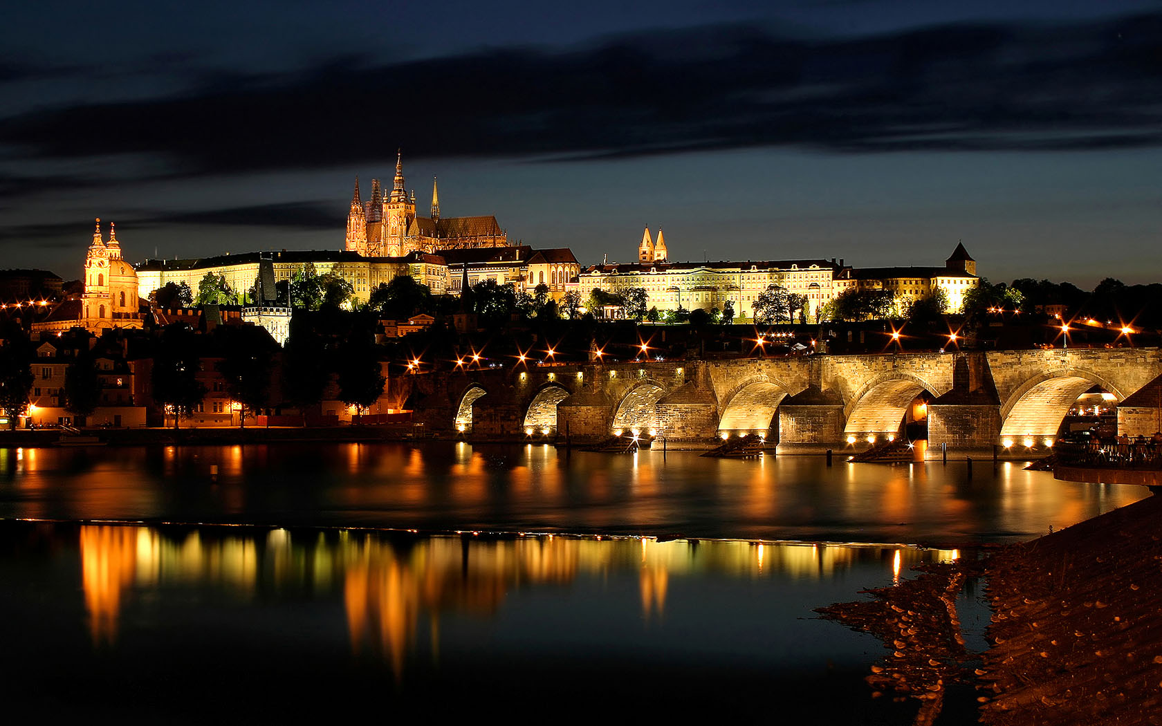 查理大桥的另一端通往著名的布拉格城堡。夜晚在河边遥望城堡,昏黄的灯光照耀着河面,对面是一片黑黝黝的山丘,中间镶嵌着宛如悬在半空的城堡。照射城堡的光并不绚丽,甚至不明亮,只是淡淡地把城堡烘托出来,营造出了神秘的氛围,令人向往。