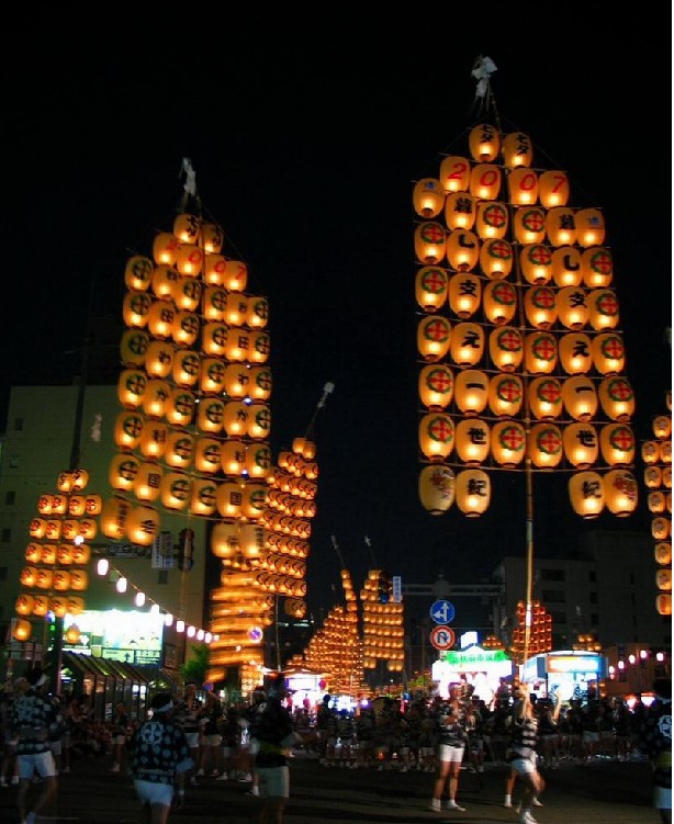 生鬼节:被指定为国家重要无形民俗文化财,流传于日本东北地方男鹿半岛。两个戴着鬼面具露着两支大獠牙的人(一个是红脸,一个是青脸),身上穿着稻草衣,握着菜刀,提着桶,挨家挨户地拜访居民,大声叫着吓唬那些不勤劳的男人、爱哭的小孩以及不愿意做家务的媳妇。该仪式,除了秋田县能代市,山形县游佐町、岩手县大船渡市三陆町吉浜等多个东北一带沿海地方都有存在。[20]秋田竿灯祭:日本东北地区代表性的夏季节庆,与青森县的耐布它祭、仙台的七夕祭并称为东北三大祭。竿灯把几十个马灯整齐地挂在一个粗竹竿上,竹竿的顶端系着“御币(剪成细条的纸)”,版权所有聊城聊之旅国际旅行社有限公司,转载必究!撑竿的人将竿灯或托于手掌,或顶于额头,或支于肩,或载于腰腹,犹如玩耍中国杂技。西马音内盂兰盆舞会(羽后町):为“日本三大盂兰盆舞会”之一,参加者身着传统服装,戴着斗笠,并用黑布蒙住脸,伴随着用笛子、鼓、三弦的演奏,一直舞蹈至深夜。西马音内盆踊,已被列为重要无形民俗文化财产。举行时间是8月16日至18日。