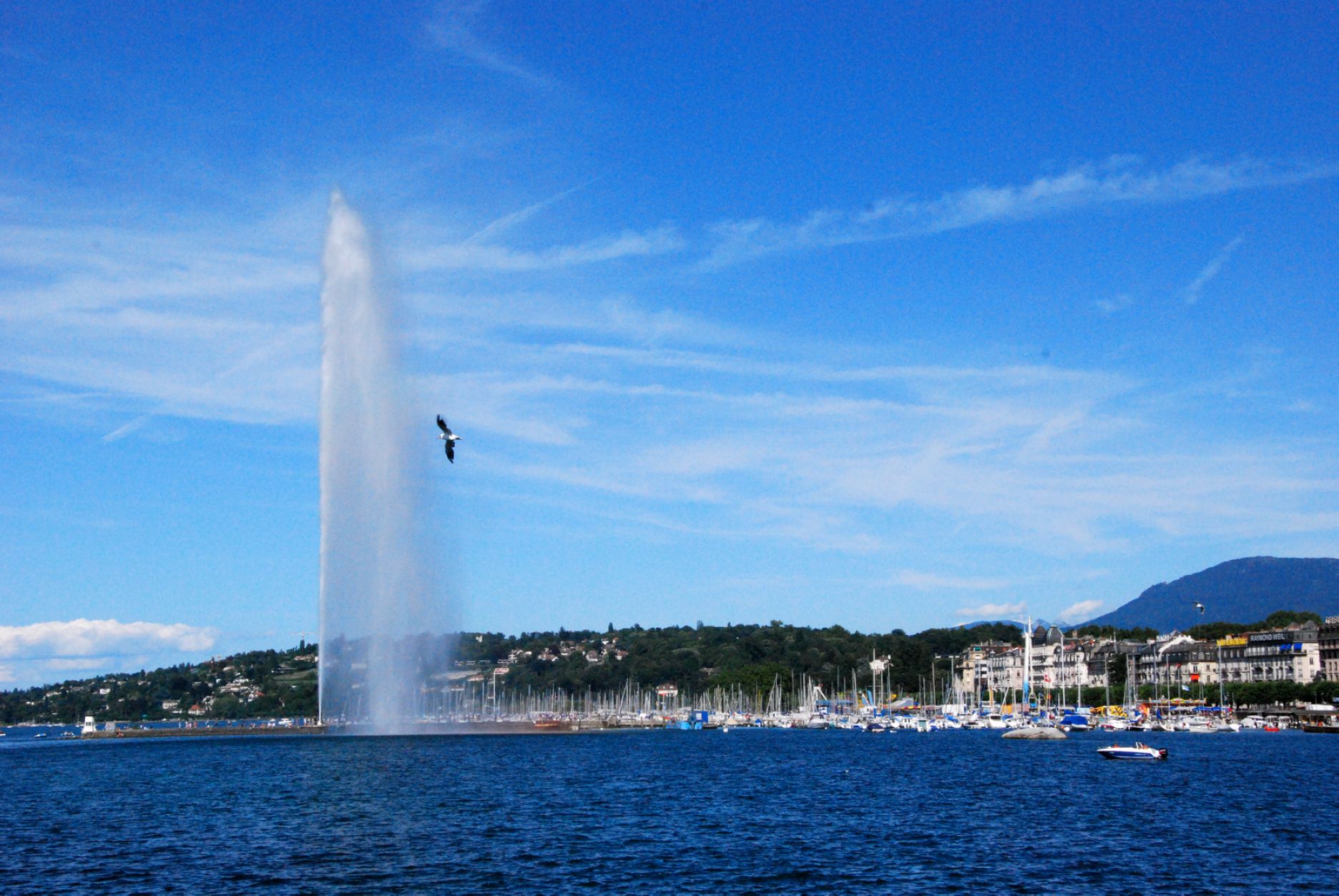 500公升喷水量的喷泉是由130马力的电力推动为世界上最大的人工喷泉,那冲天而起的高大水柱,从湖面直射天际,蔚为壮观。这个人工喷泉最初是1891年建成,当时所喷射的高度只有90米。1958年改建后至今。它的动力是两组安装在水下的水泵,总重为16吨,由每分钟达1,500转的500千瓦2,400伏的发动机带动。每个水泵的功率为1,360匹马力,喷泉的流量为每秒500公升,喷口处的水速达每小时200公里,进入喷水管中的水的压力为16个大气压,水柱的高度在无风时可达140米,停留在空中的水量达7吨之多。水从喷嘴喷出达到顶峰再回到水面,每个回合为16秒。日内瓦湖是美丽的。自古以来,许多名作家、大诗人都赞美、讴歌过它。亨利•詹姆斯称它是“出奇的蓝色的湖”;拜伦则把它比喻成一面晶莹的镜子,“有着沉思所需要的养料和空气”;巴尔扎克则把它说成是“爱情的同义词”。其壮观景象,从日内瓦各地都可以望得见,如今大喷泉于每年三月初到十月的第一个礼拜天为止,除了阴雨天之外,每天都准时做“喷水表演”,供民众参观。