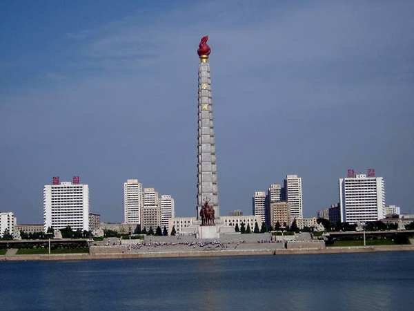 主体思想塔(주체사상탑 Juche Tower) 位于朝鲜民主主义人民共和国首都平壤市市中心的大同江畔,是为祝贺金日成七十寿辰而建的,塔及其周围附属建筑占地总面积15万平方米。1982年4月15日竣工揭幕。主体思想塔是金日成主席创立的“主体思想”的象征。塔的正面,建有高30米、重33吨的象征工人、农民、知识分子的三人群像,左右是以“主体工业”、“丰年”、“学习之国”、“无病长寿”、“主体艺术”、“铜墙铁壁”为主题的花岗岩群像。