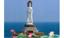 海上观音比自由女神还要高15米,所以海上观音是世界上最大的石像了。观音圣像一面是手拿莲花,另一面是手拿金书,还有一面是手拿佛珠。为正观音的一体化三尊造型,宝相庄严,脚踏一百零八瓣莲花宝座,莲花座下为金刚台,金刚台内是面积达15000平方米的圆通宝殿。金刚台由长280米的普济桥与陆岸相连,并与面积达60000平方米的观音广场及广场两侧主题公园,共同组成占地面积近30万平方米的“观音净苑”景区。