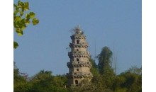 镇风塔在饶平县拓林镇东北l千米的风吹岭西麓。困拓林地处海滨,屡遭风潮之害,昔人于岭高面海,常年风声飒飒的风口处建塔,取镇风镇水之意,故名。元至正十三年(1353年)二月建,塔高22米,基围16米,七层八面,塔身各层用石板铺盖,游人可在塔内沿螺旋形石阶登上各层,塔廊还装有石栏杆,每层开设圆窗和拱门,可供游人步出塔廊览观山胜。